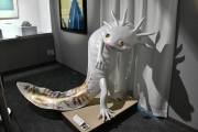 左写真は、村上隆。壁にかかっているのが、「赤鬼と青鬼と48の羅漢」、手前に置かれているのは、左が「Mr.DOBtopus B」、「Mr.DOBtopus A」。中写真は、井上裕起の「サラマンダー「松竹梅」」。その右は、岡本太郎作品の集合写真 [^J^]。個々のキャプションの確認は省略しました。[;_ _][;^J^]
