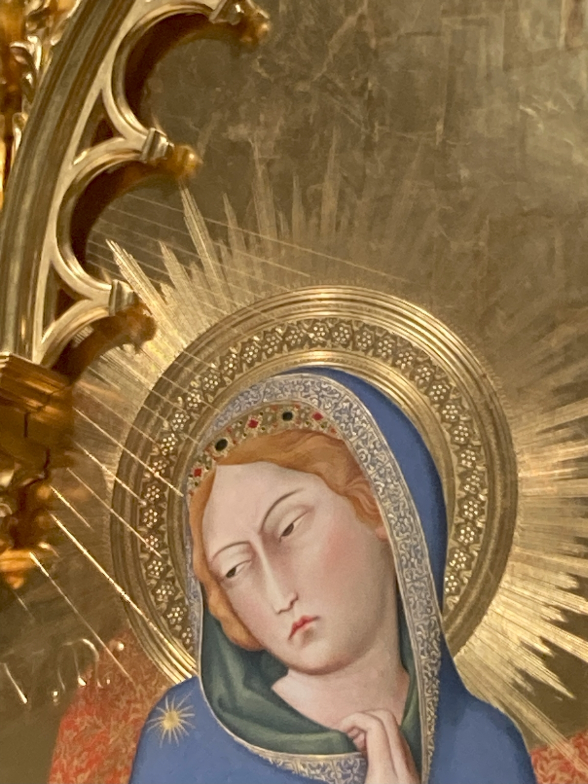 シモーネ ・ マルティーニの「受胎告知」の、テンペラ画による復元模写。テンペラ画というのは中世の絵画技法で、顔料を「卵黄」で練るのである。若い頃にそのことを知ったときには、「なんと不安定な。腐食しないのだろうか..」と心配したものであるが、実は発色も保存性も極めてよい、堅牢で、細密描画にも向いている技法だとのこと。
