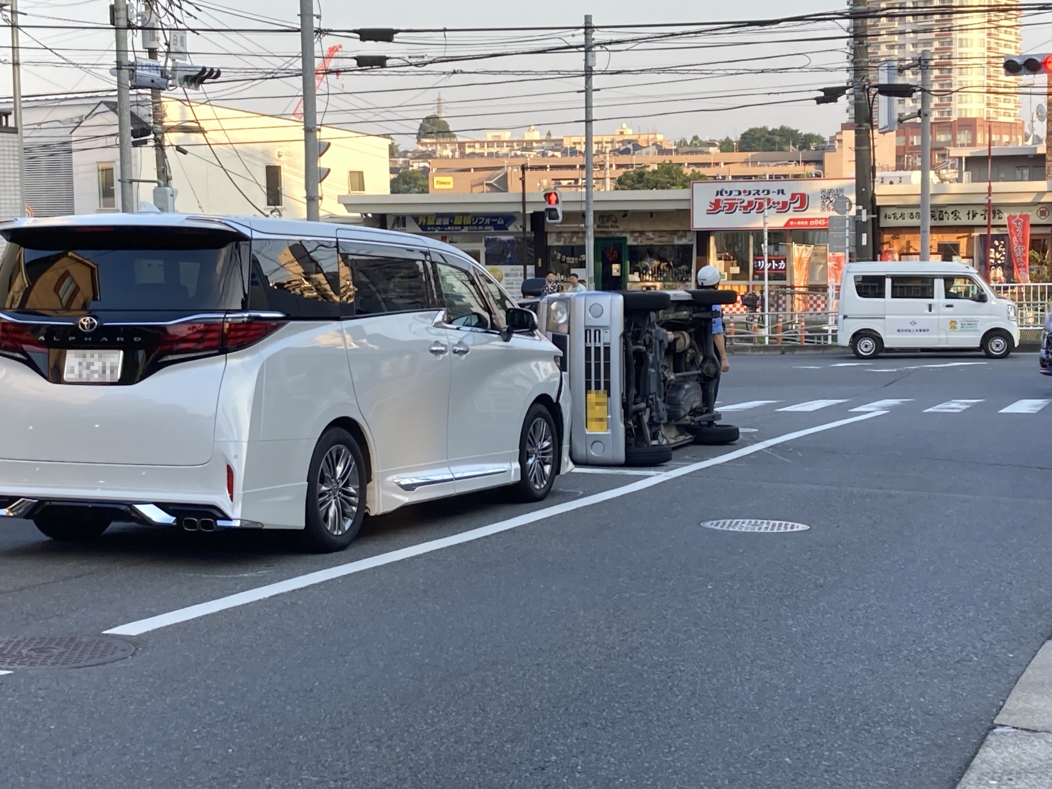 ..おやおやまぁまぁ。白根通りが16号に接続する(事実上の)T字路の直前で、横転している車がある。野次馬となって邪魔をしてはいけないので、通りすがりにささっと写真を撮っただけだが..いったいどうやったら、こんな器用な転びかた、できるの? 見たところ大した破損は..というか、ほとんど破損してないし、希望的観測だが人的被害も(あったとしても)軽微そうだ。とにかく現場にも事故車個体にも「スピード感」がないのである。まるで、止まっていた車を単に横倒しにしたみたいな..しかしそれにしては、倒れている場所と方向が、おかしい..[?_ _][?_ _][?_ _][;^.^]
