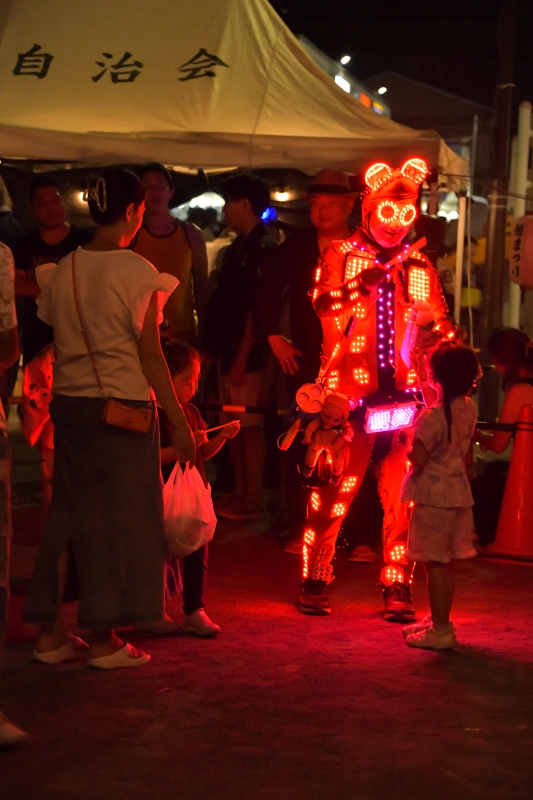 19:25に盆踊り終了。引き続き小学生たちによる「英語でミュージカル」が始まる。(マイクが使えないので、歌入りの音楽を流して踊るのみ。)このあたりで(人波も落ち着いてきたし)私はお役ご免。再び公園内をそぞろ歩く。右端写真のテントの中は、射的。