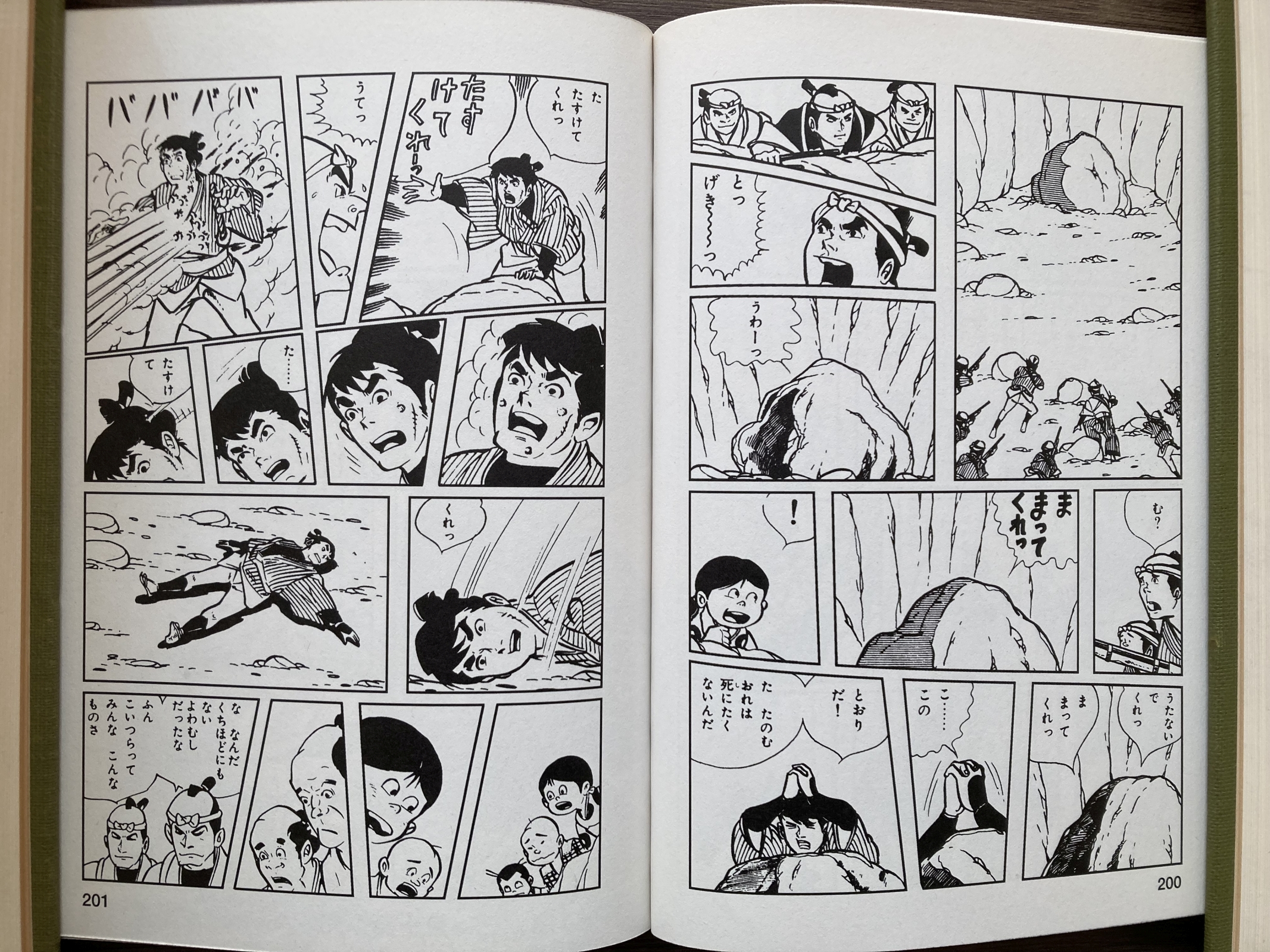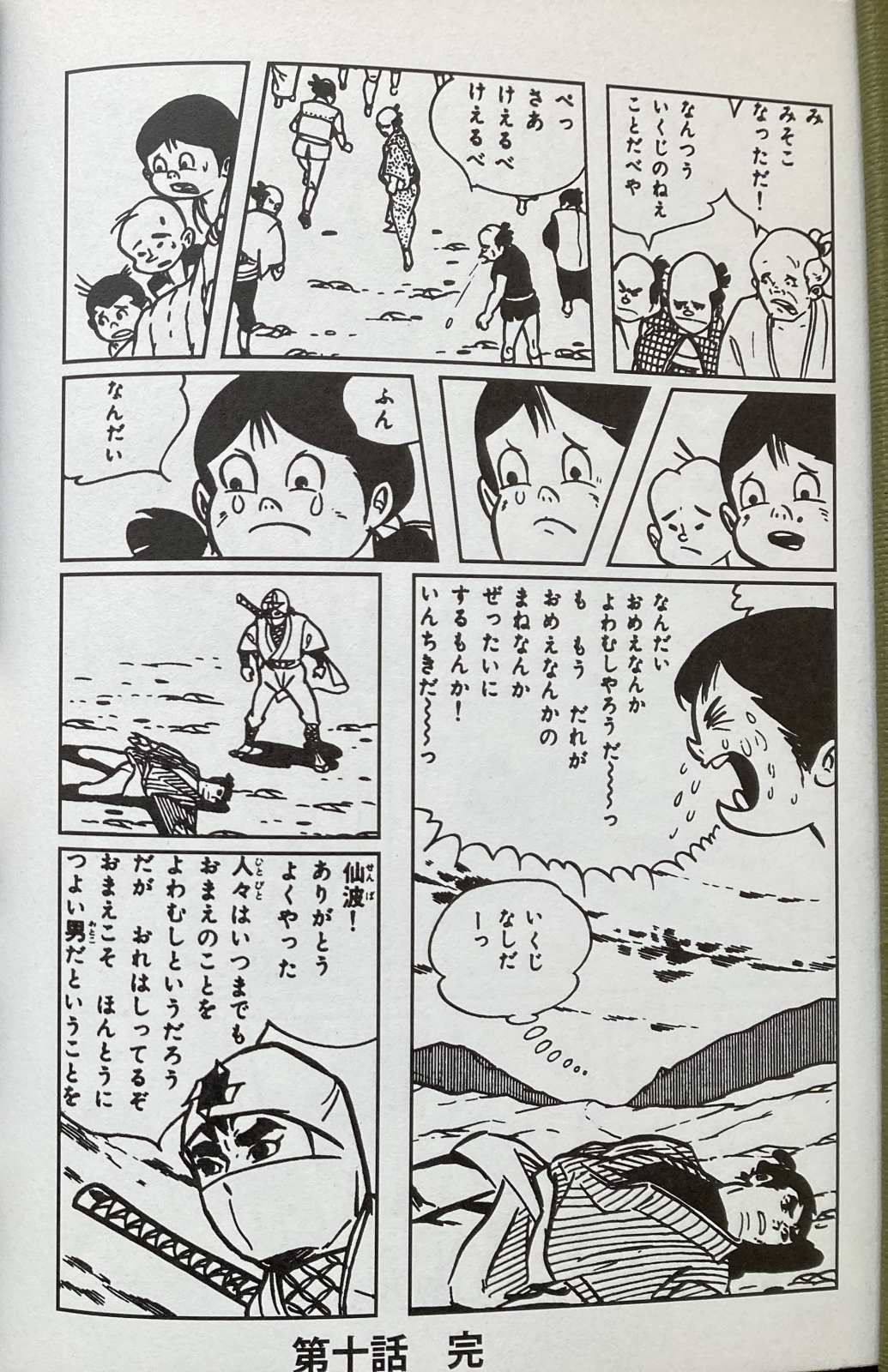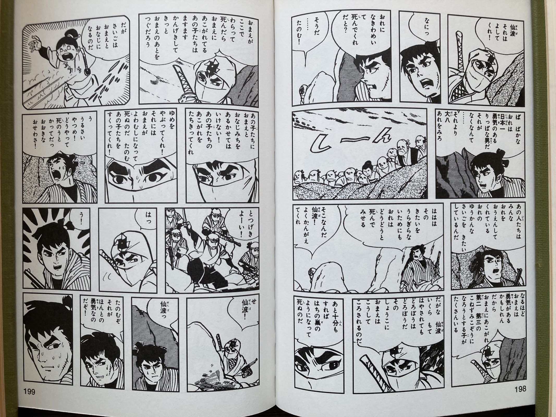 (右から、ラスト5頁。)義賊・こねずみこぞうと対峙する、主人公・赤い風車。こねずみこぞうは、実は彼の旧友・仙波だったのだ。捕り手たちに囲まれたこねずみこぞうは、彼を応援する民衆たちの目の前で見事な死に様をみせる覚悟であるが、赤い風車は、それだけはしてくれるな、と、説得する。なぜならば..