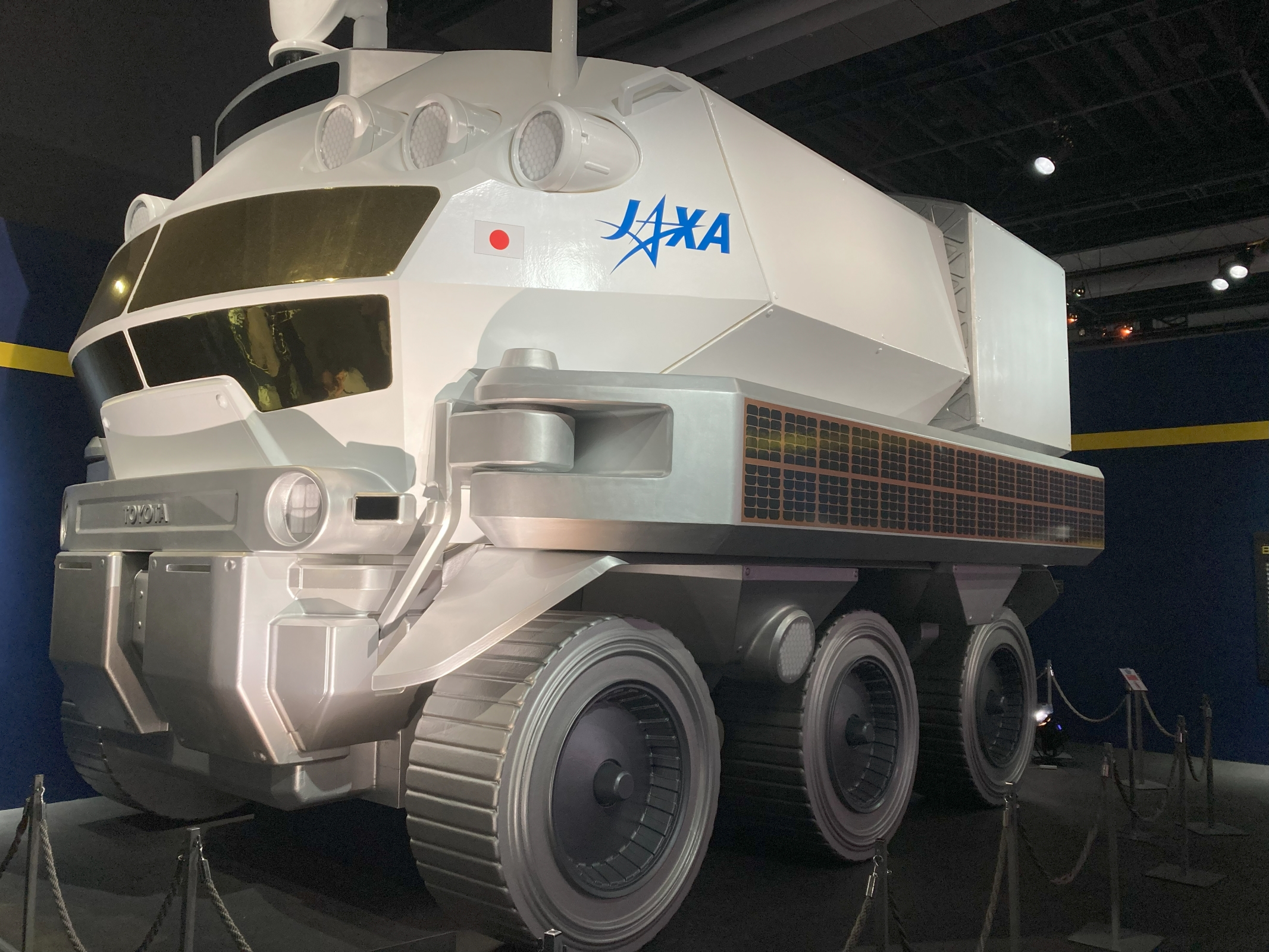 左端写真は、JAXAとトヨタが開発中の「有人与圧ローバー(有人月面探査車)」。月面で2人の宇宙飛行士が宇宙服を着ずに1年のうちに1か月間活動できる。想像していたよりも大きい。