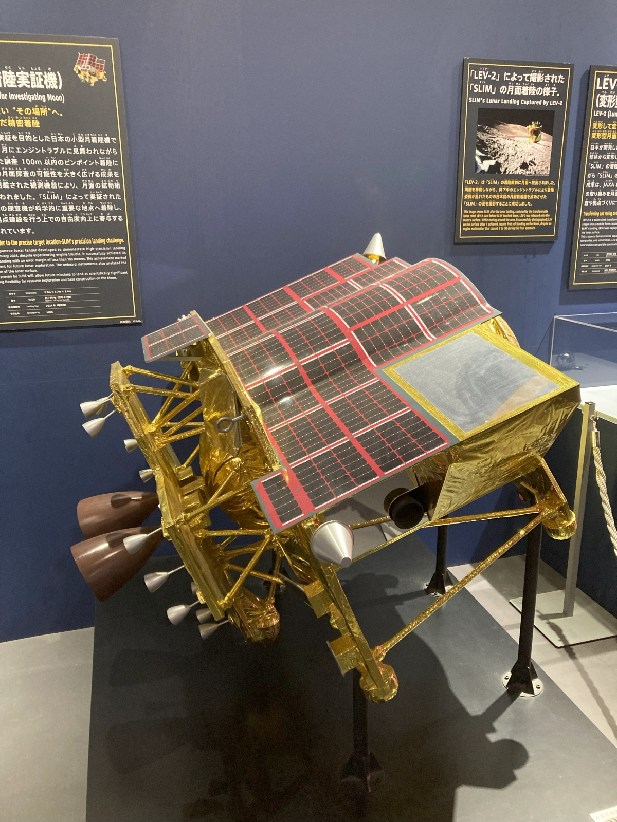 中写真は、ご存知、月面への誤差100m以内のピンポイント着陸を(しかも倒立姿勢で [^.^])決めたSLIM(小型月着陸実証機)の、1/2模型。右端写真は、そのSLIMの雄姿を撮影した、LEV−2(変形型月面ロボット)の実物大模型。実にかっこいい。できれば動いているところを展示して欲しかったところである。