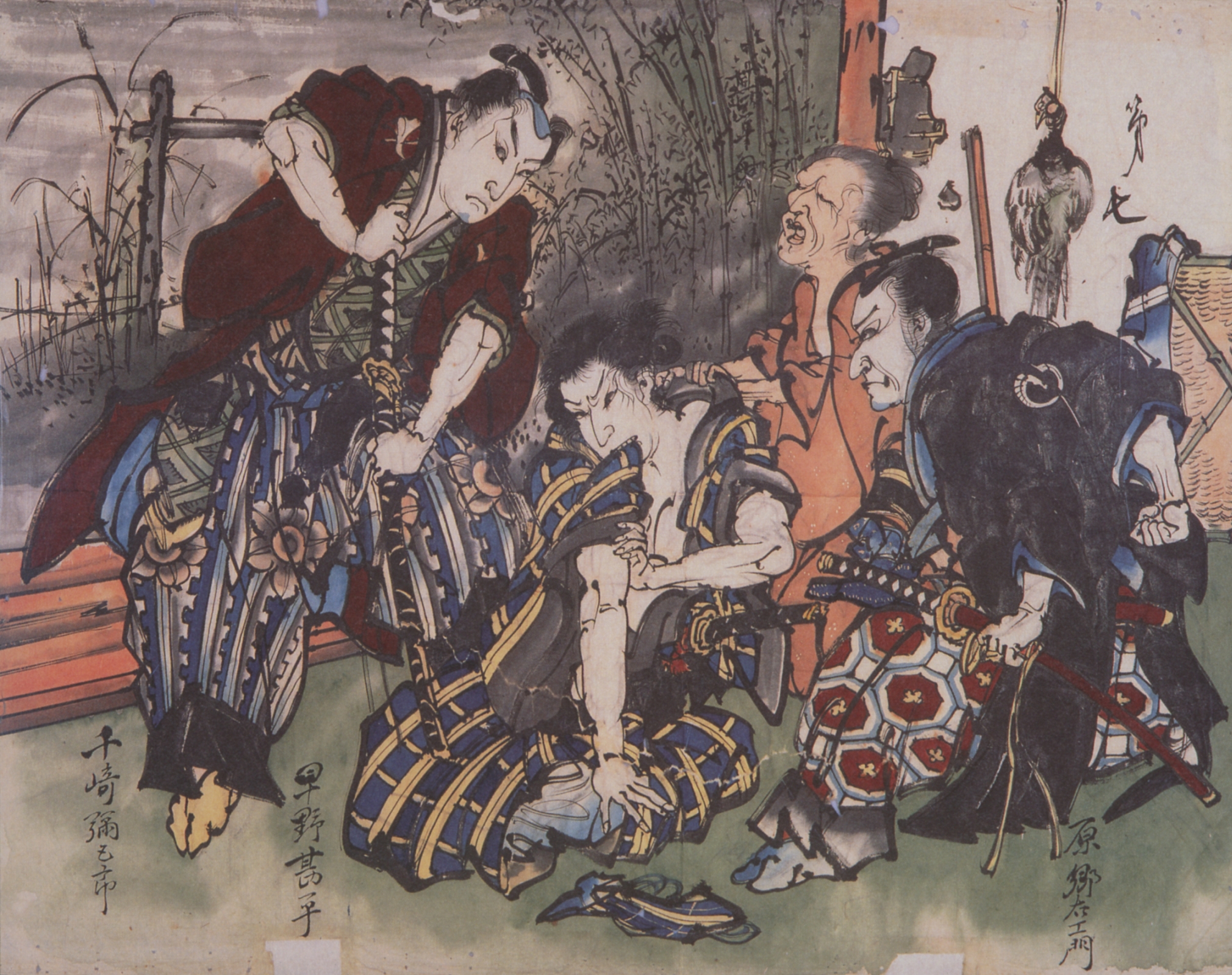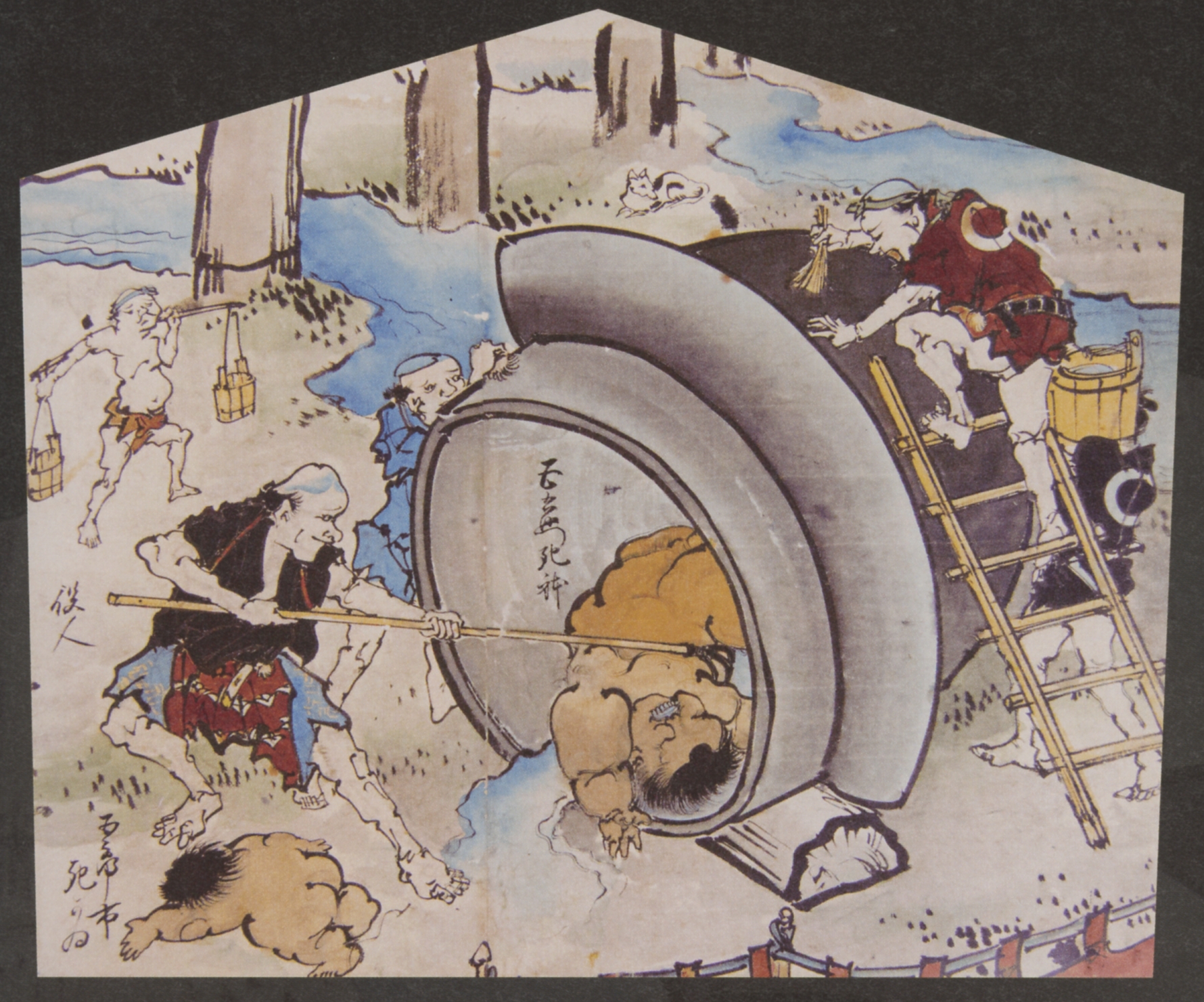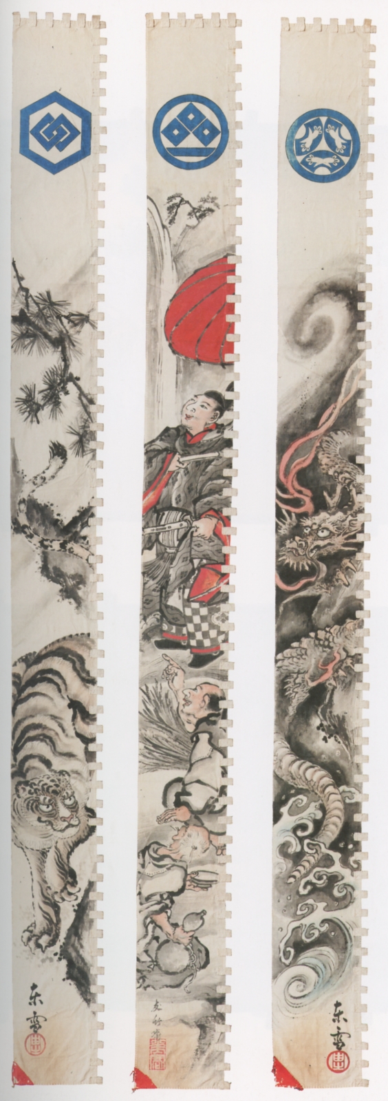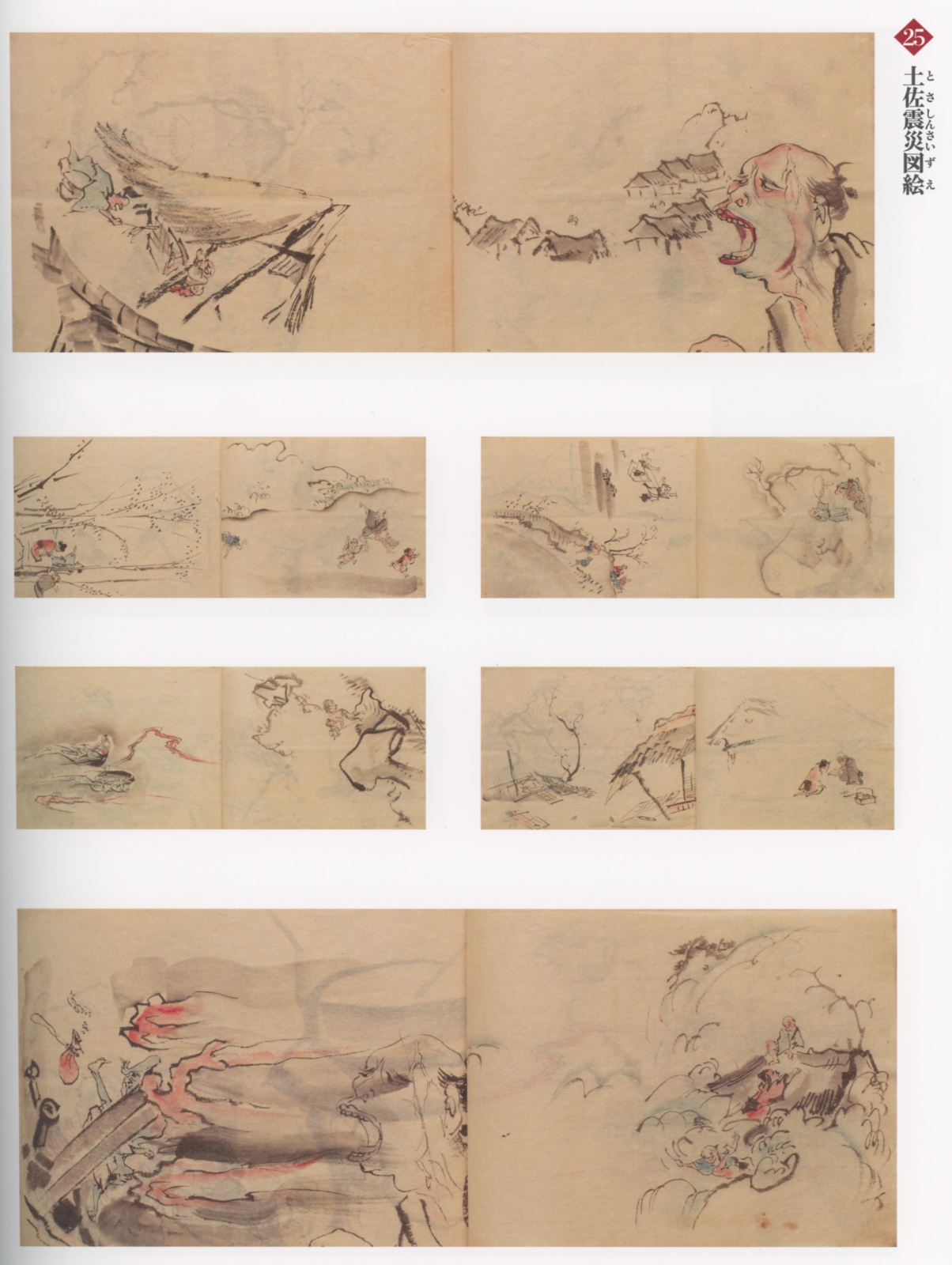 芝居絵以外からも、数点ご紹介。左から、「常盤御前図」。雪の中の逃避行図なのであるが、少なくとも子ども達は、なんだか楽しそうである [;^J^]。「三人上戸」は、多数残されている白描画(墨一色の線描画)から、笑い上戸、怒り上戸、泣き上戸のスケッチである。「土佐震災図絵(抄)」は、安政元年(1854)の安政東海地震、安政南海地震、安政二年(1855)の安政江戸地震の、いずれかに取材したもの。「養老の滝図/龍虎図」は合作であり、中央の養老の滝図」が絵金、左右の「龍虎図」が宮田洞雪の作。