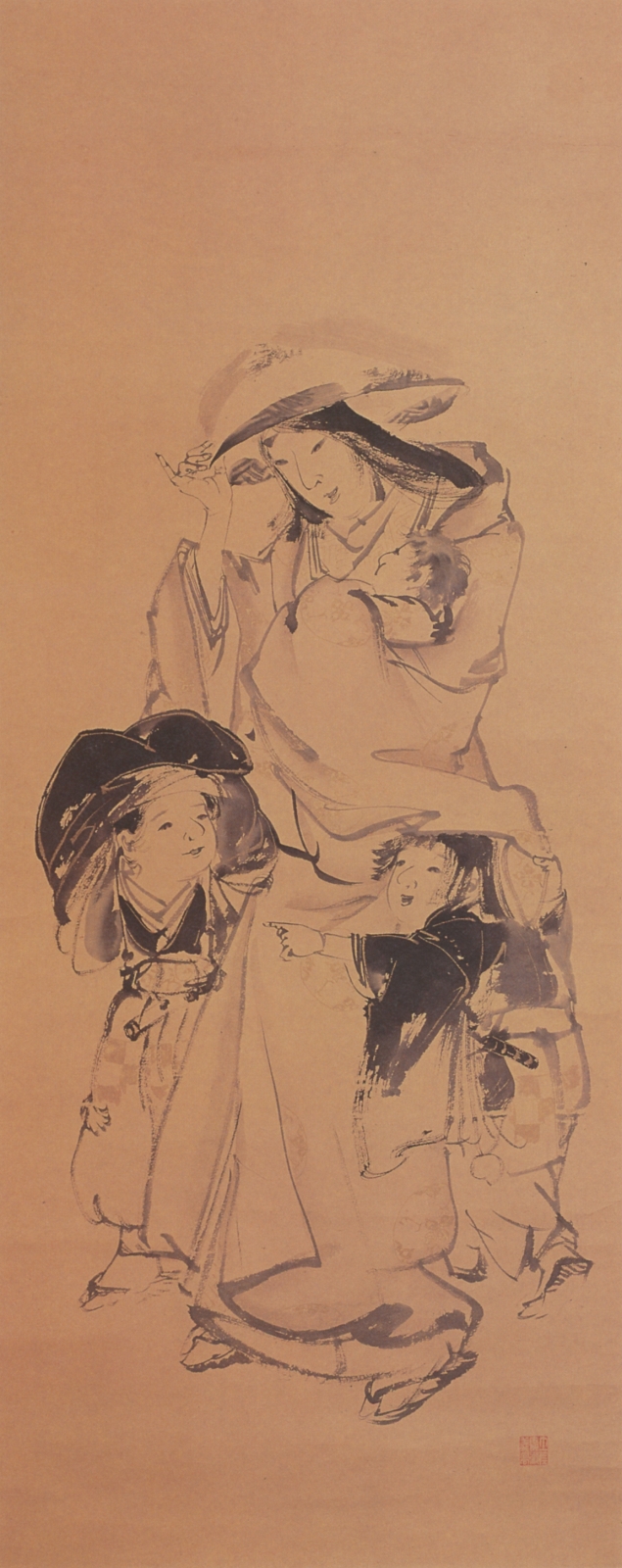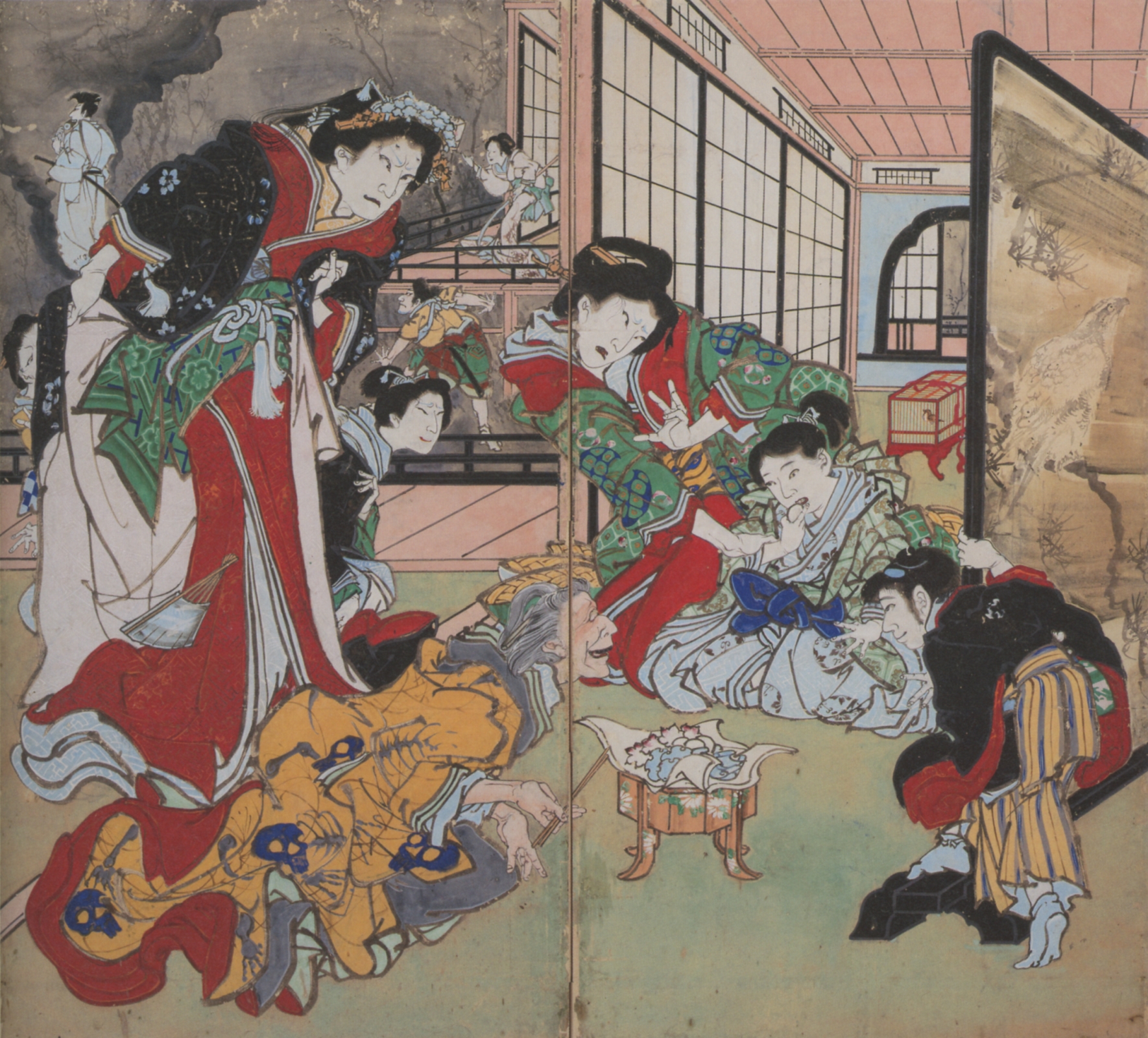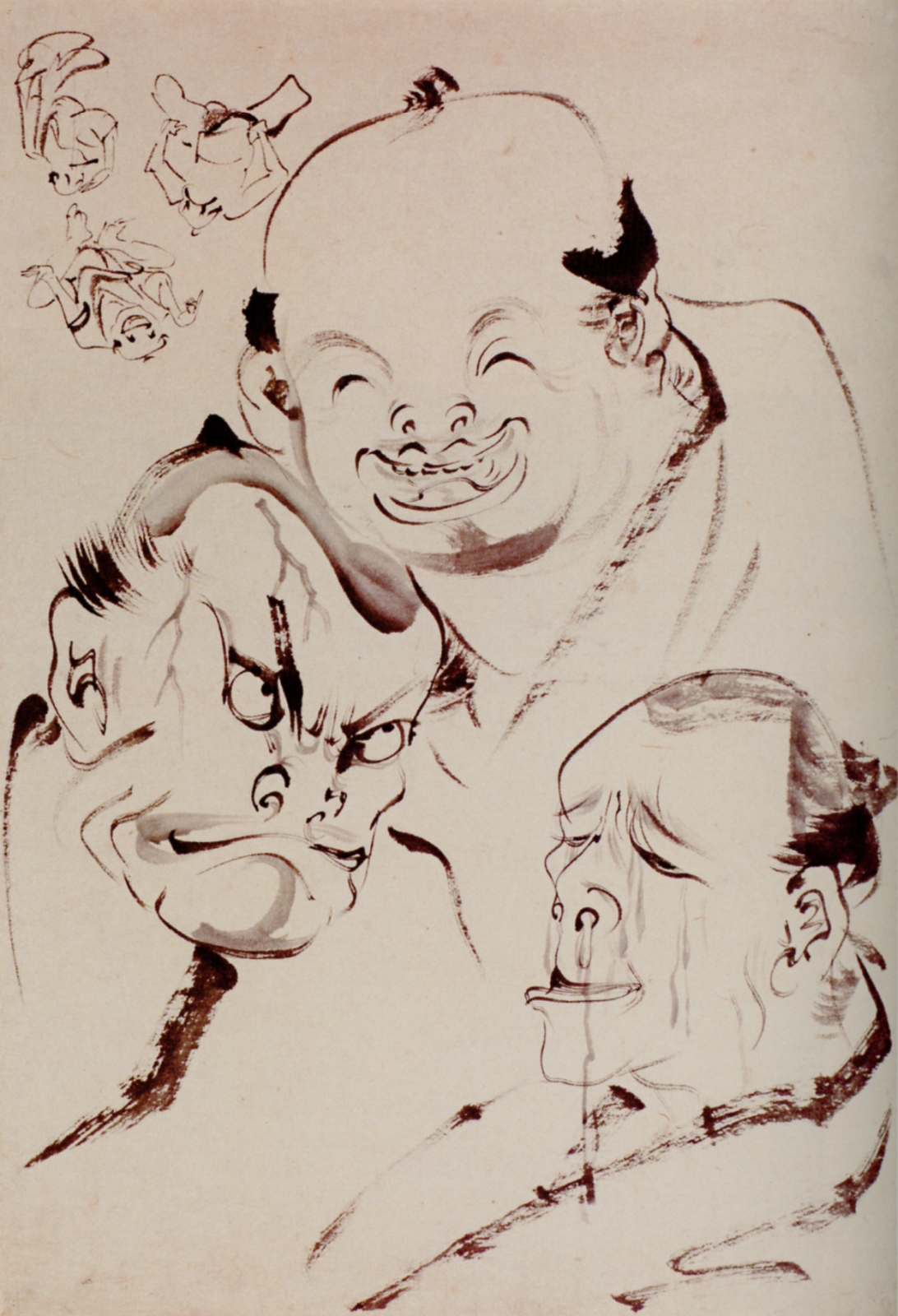 芝居絵以外からも、数点ご紹介。左から、「常盤御前図」。雪の中の逃避行図なのであるが、少なくとも子ども達は、なんだか楽しそうである [;^J^]。「三人上戸」は、多数残されている白描画(墨一色の線描画)から、笑い上戸、怒り上戸、泣き上戸のスケッチである。「土佐震災図絵(抄)」は、安政元年(1854)の安政東海地震、安政南海地震、安政二年(1855)の安政江戸地震の、いずれかに取材したもの。「養老の滝図/龍虎図」は合作であり、中央の養老の滝図」が絵金、左右の「龍虎図」が宮田洞雪の作。