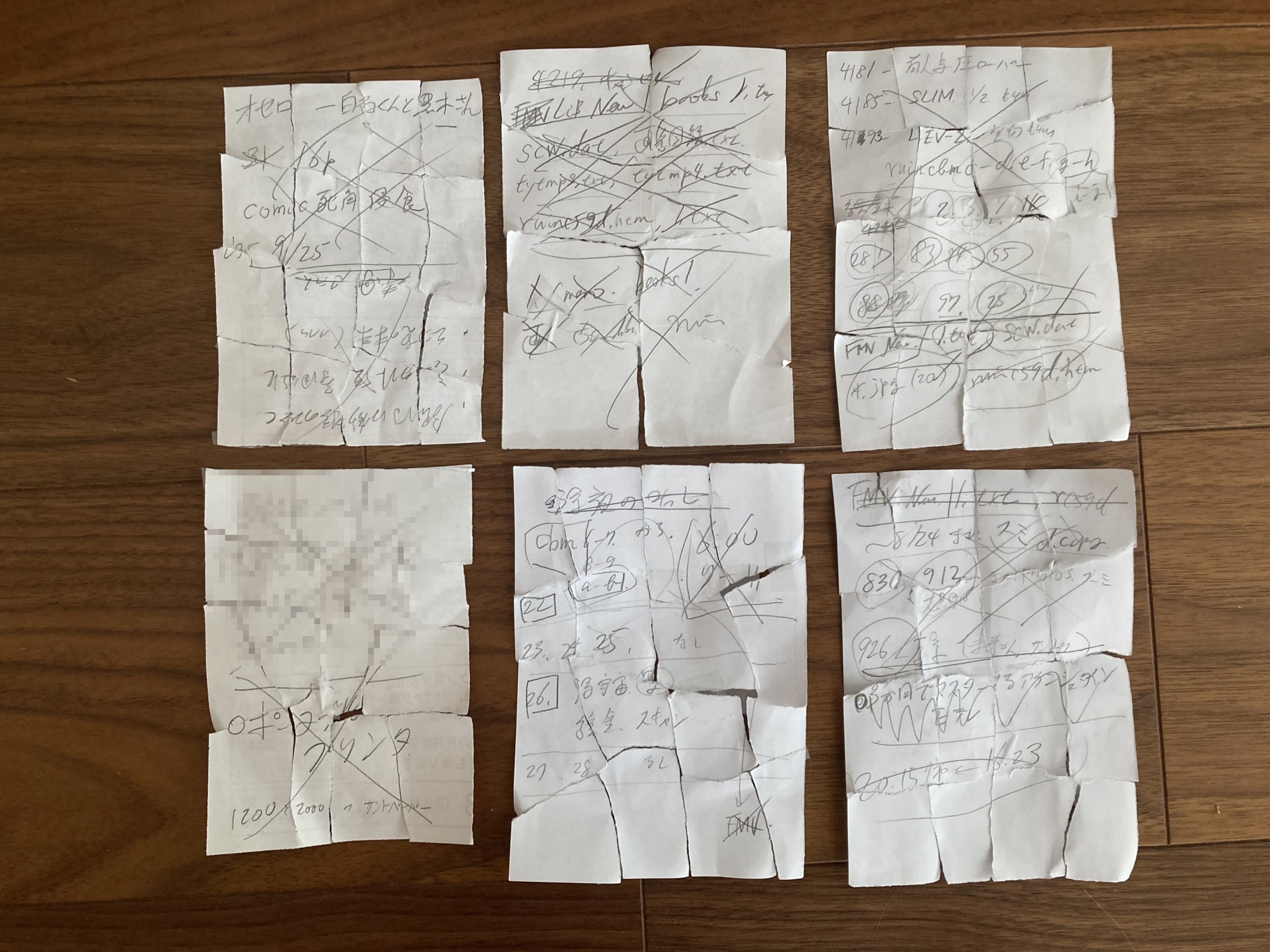 思い出せないが、なにか大事な要件のメモをうっかり破ってゴミ箱に捨ててしまったような気がして不安になってゴミ箱をひっくり返し、6枚のメモ用紙を各16片に破った紙片(計96枚)を、2時間以上かけてジグゾー復元。[;^.^](不適切な個所にはモザイクかけてます。[^.^])