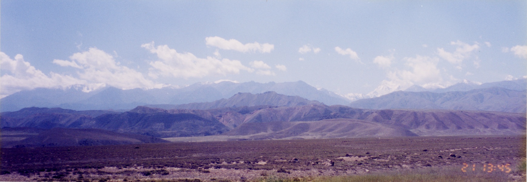 ニッサンの19人乗りマイクロバスと、トヨタのランドクルーザーで、9:59、砂漠に向かって出発。メンバーは、日本人が前記の6人、中国人が7人、計13人である。中国人のメンバーは、李先生と、その助手で、実務一切を取り仕切って下さったシュクルトさん(ウイグル族。ちなみにこの人も、日本語が必要十分に話せ、中国語がまともに話せるメンバーがひとりもいない日本人一行としては、実に心強かった)。中国政府の役人である劉長剣さん(学校を卒業して間もないと思われる、若い女性。別に監視要員ではなく [;^J^]、来年、我々の今回のツアーと同じ場所でキャンプを催行する予定だとかで、下見として参加)と、その上司の係長氏と課長氏。学生(Jurassic Park の原書を、ずっと読んでいた)と、運転手氏。