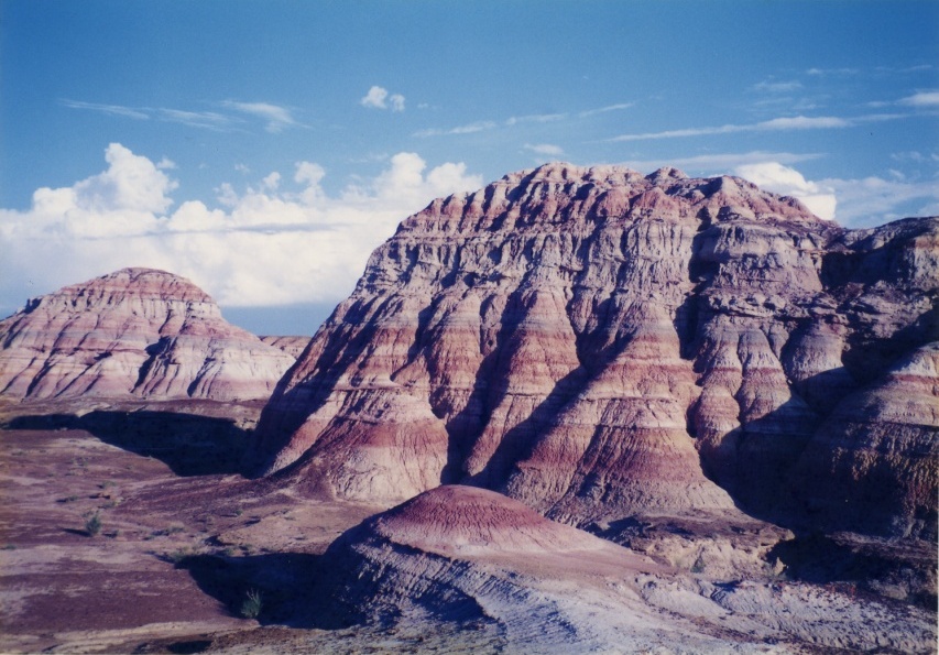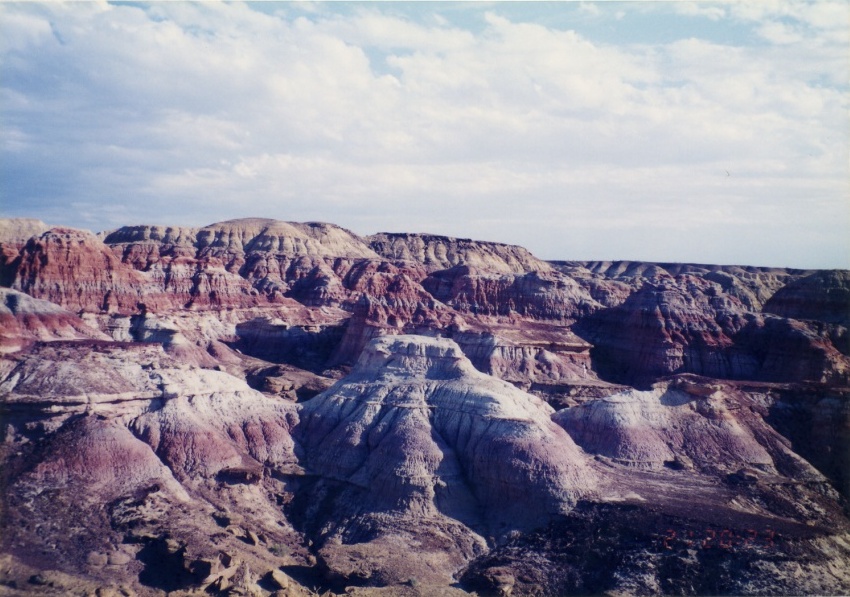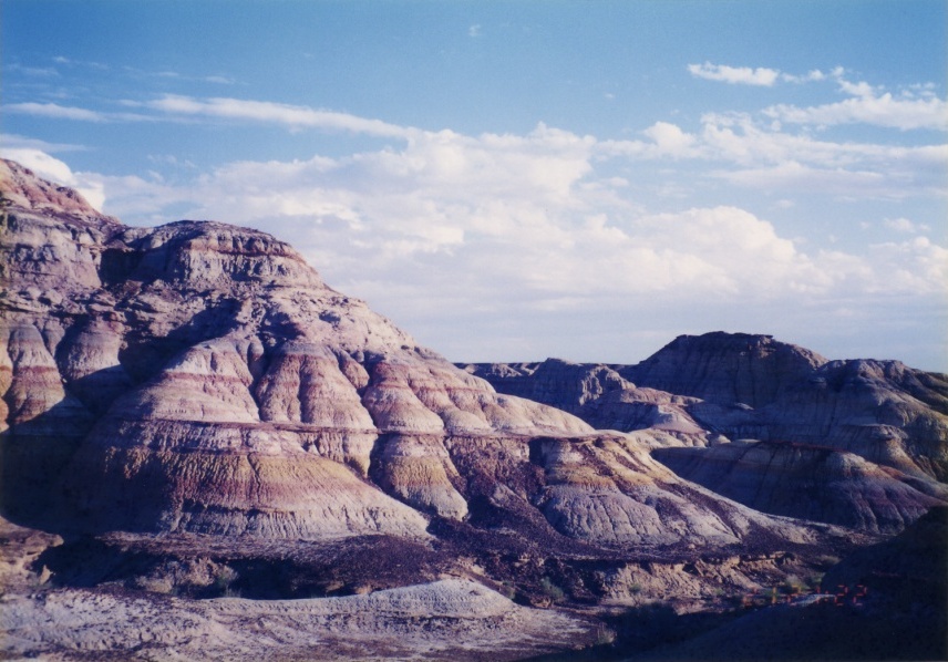 写真では知っていたのだが、それにしても第一印象は「冗談だろ」であった。非常に深く侵食された奇岩群が、その(侵食された)地形とは無関係に、かなり幅の狭い、五色、いや十色以上の水平の縞模様で彩られている。植物ならともかく、岩石それ自体が、これほど様々な色合いで彩られているのを、初めて見た。ジュリアン・メイではないが、まさに“多彩の地”である。