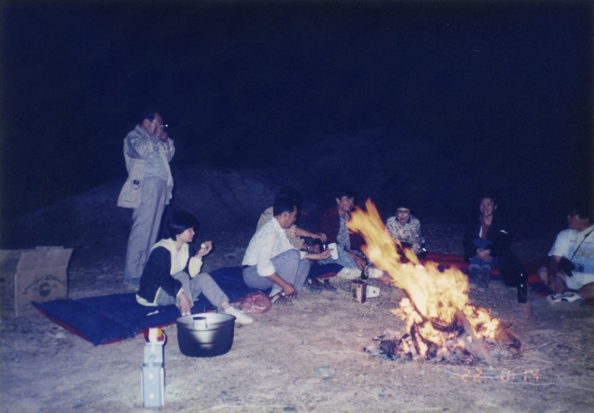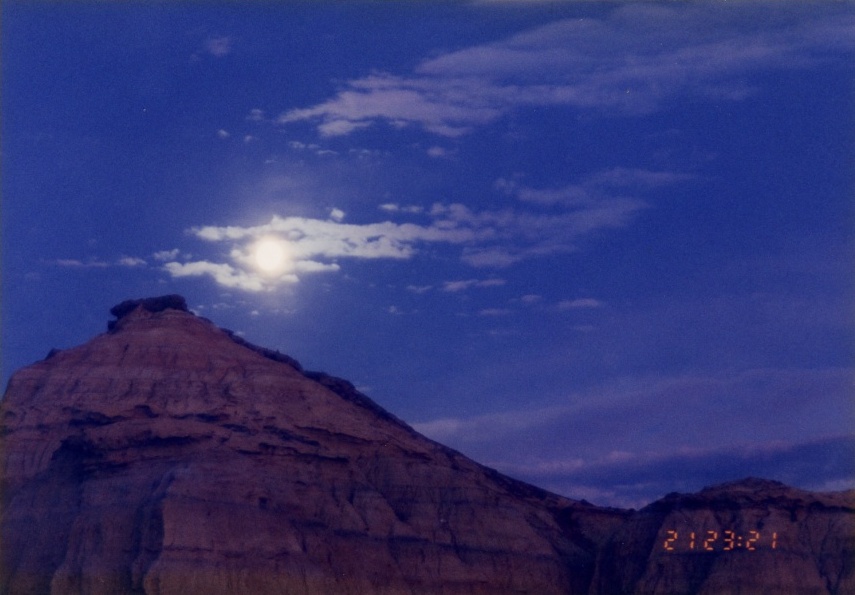 22:00、食事。中国製の辛口のカップ麺と、スイカと、トウモロコシ。1時間ほどしてから、キャンプファイヤー。最高の月夜である。(月齢14日位か?)日中それぞれの、月の歌を披露しあう。ビールは生温い新彊ビール。栓抜き無しで栓を外す技を、李先生に教えてもらう。(つまり、栓抜きが無かったのだ。[;^J^])勿論、白酒も、たっぷりと飲む。