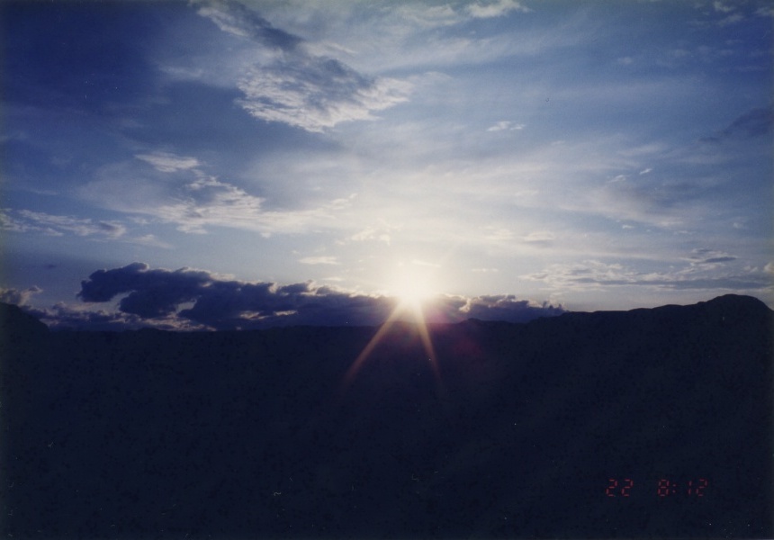 7月22日、5:50、ドライバー氏の傍若無人の歌声で叩き起こされる。[;^J^] 夜明けの写真を撮るポジションを決めるために、カメラと三脚を持って岩登り。それなりの写真が撮れたが、どうやってここまで登ってきたのか判らず(お前は猫か [;^J^] )、面倒なので、地表までの最短コースを強引に降りる。幸運にも怪我ひとつせずに降りてから見上げてみると、20m近い絶壁であった。[;^J^]