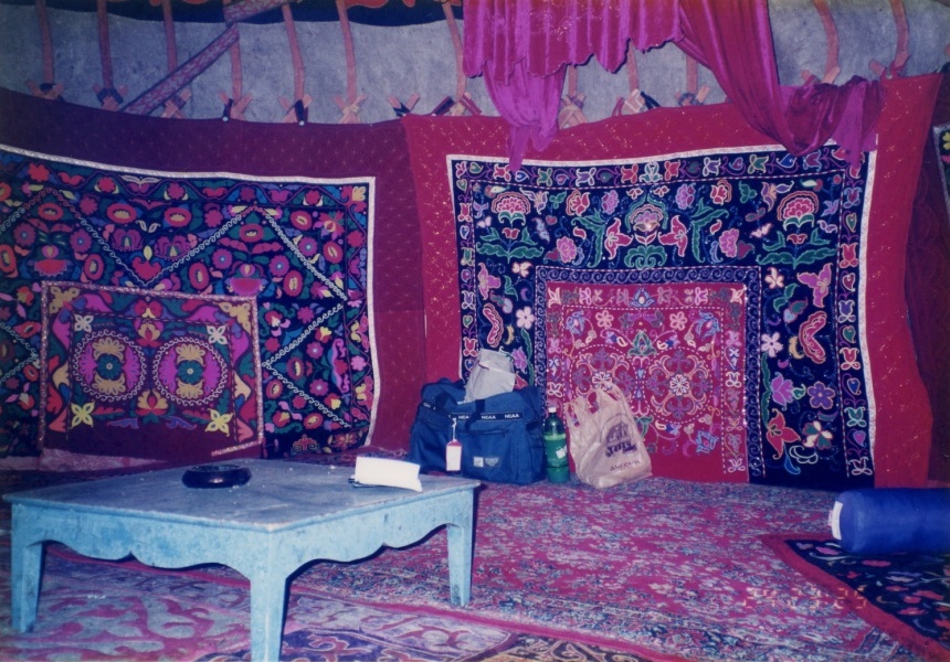 天池は、ボゴダ山脈の主峰ボゴダ山の中腹、海抜1980mにある、砂漠地帯の中とは信じられぬ、豊かな森に囲まれた風光明媚な小さな湖である。気候はほとんど肌寒い。この地区の重要な観光スポットのひとつで、観光を生業とするカザフ族、その他の少数民族(見分けられない)が、大勢いる。とにかく車で山道を登っていくに連れて、馬に乗ったカザフ族の人達が、どんどん増えるのである。また、山羊、羊、牛が放飼いにされている。登り詰めた地点が、天池湖畔の、ちょっとしたペンション街(高々10戸で、食堂と土産物屋が数軒ずつ)で、そこにある観光用のパオに、今夜は泊まるのである。