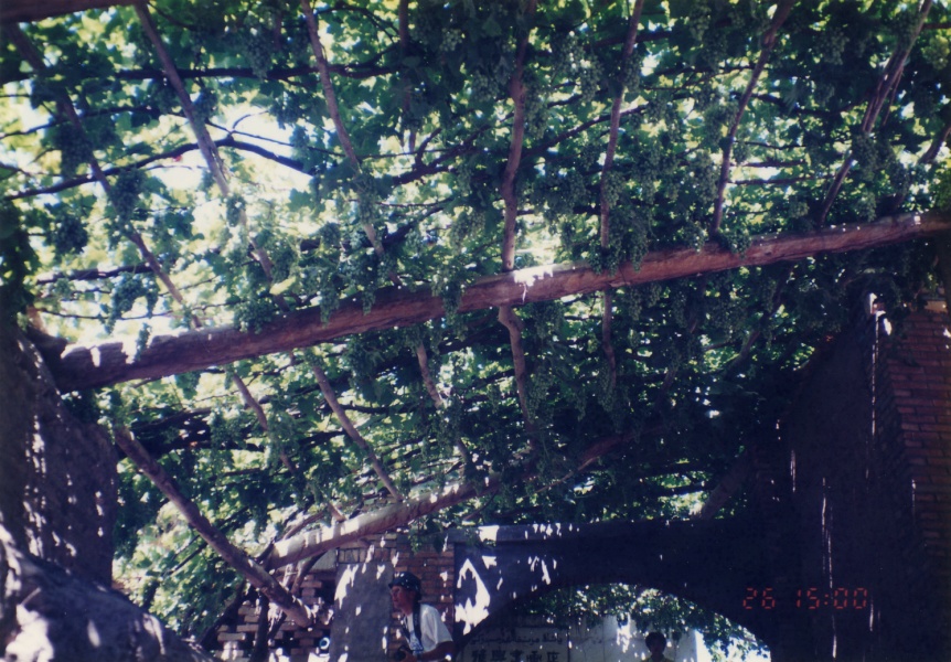 13:00、トルファン郊外の葡萄園に着き、休憩。川の水は豊かに流れ、強い陽射しは葡萄の葉に遮られて、キラキラと緑色の輝きを放っている。すぐそこが砂漠だとは、到底信じられない。池の中では名も知らぬ、美しい魚が泳ぎ回っている。干葡萄がそこここに山とつまれて売られている。土産物としてしこたま買う。これは日本で、なかなか好評であった。日持ちがするし、おすそ分けしやすいので(忘れていた時に便利 [;^J^] )、当地の土産物として、お薦めである。
